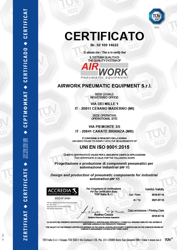 Air Work 是一家意大利制造公司,专门从事工业自动化气动领域标准和定制解决方案的开发、制造和营销。Air Work 是一个通过 UNI EN ISO 9001 和 14001 认证的综合集团的一部分,该集团已在该行业运营了 25 年,拥有现代化且经过验证的设计系统、性能卓越、灵活性强的生产线、装配和生产线。以高标准的质量控制和检测对产品进行测试。我们员工的经验和可用性是组织效率和高质量标准的附加值。我们现实的这些特征要素使我们有信心通过不断创新我们的产品来实现新的、雄心勃勃的目标,以满足客户的需求。